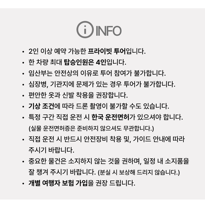 - 2인 이상 예약 가능한 프라이빗 투어입니다.