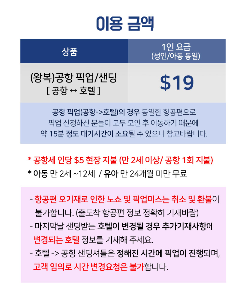 - 항공스케줄을 정확히 입력해주세요. 항공편 오기재로 인한 노쇼 및 픽업미스는 취소 및 환불이 불가합니다.