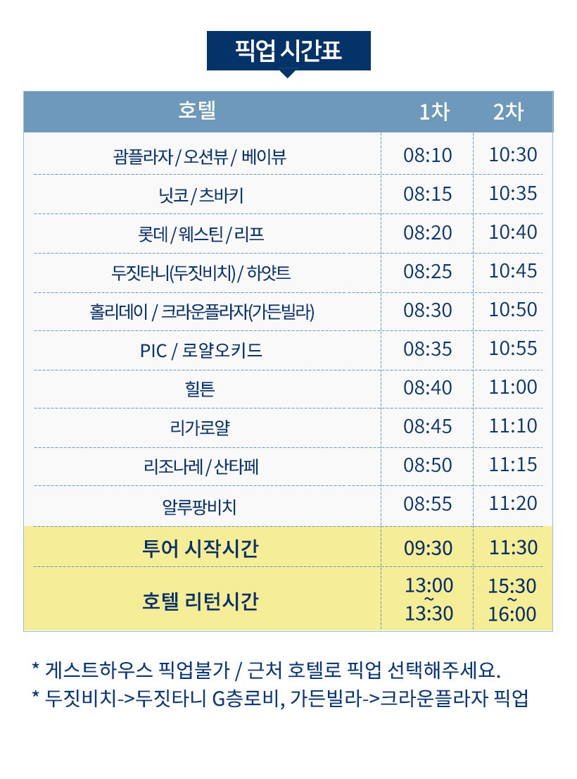 - 픽업시간은 현지 교통사정에 의해 조금 늦어질 수 있는 점 양해부탁드립니다.