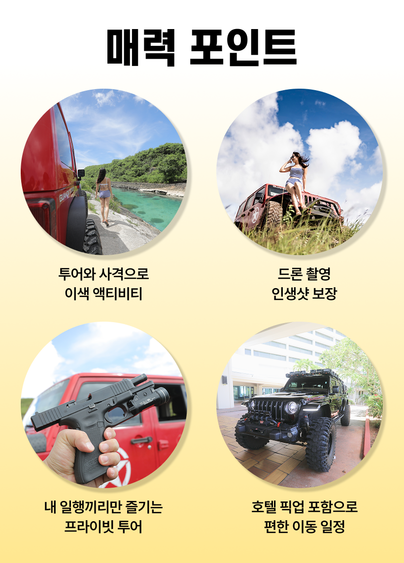 본 상품은 지프 오프로드 남부 투어와 실탄 사격이 결합된 패키지 투어입니다.