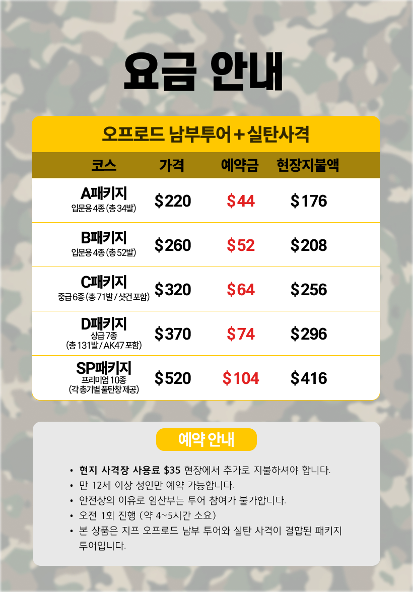 - 현지 사격장 사용료 $35는 현장에서 지불하셔야 합니다.