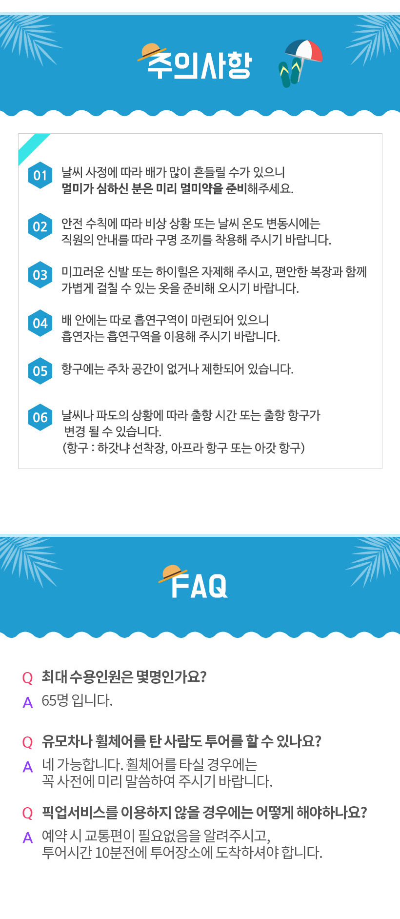 - 날씨 사정에 따라 배가 많이 흔들릴 수가 있으니 멀미가 심하신 분은 미리 멀미약을 준비해주시기바랍니다.