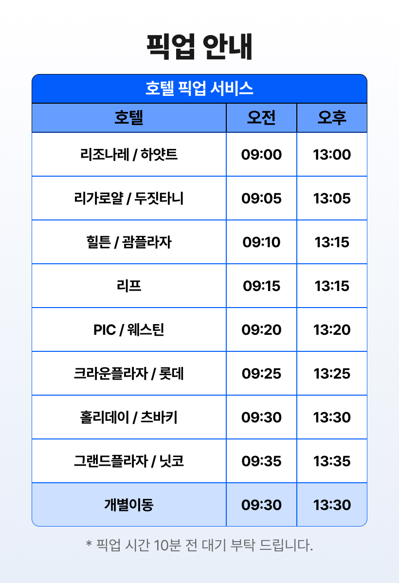 - 픽업시간은 현지 교통사정에 의해 조금 늦어질 수 있는 점 양해부탁드립니다.