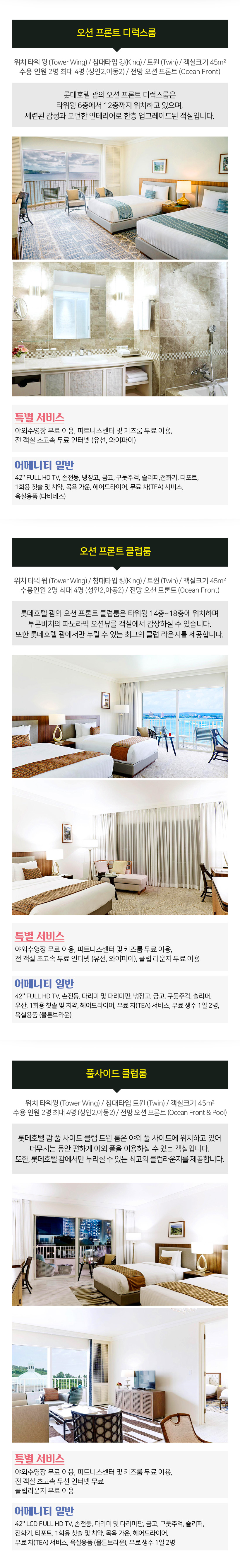 | 객실 타입 | (윙)파셜 오션 디럭스, (윙)패밀리 스윗, (타워)오션프론트 디럭스, (타워) 오션프론트 클럽, 프리미어 이층 침대룸(벙커 베드룸) |