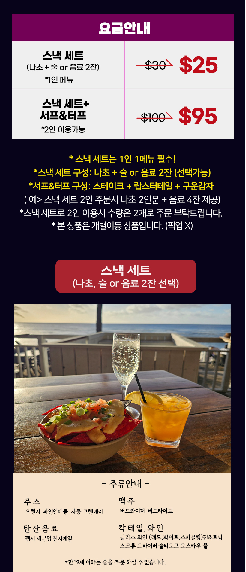 - 알코올 주문시 신분증(여권 등)을 챙겨주세요.
