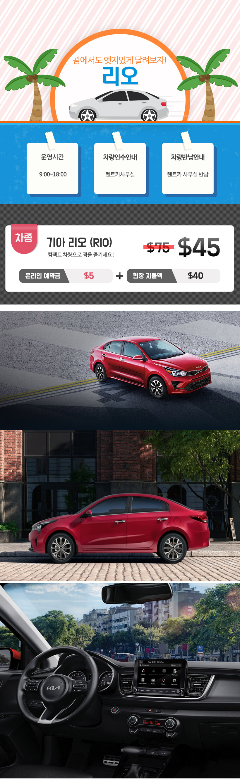 - 괌의 도로는 한국 도로보다 미끄럽습니다. 필히 안전운전 하셔야 합니다. 정원 외 탑승 후 사고시 보험처리 되지 않습니다.